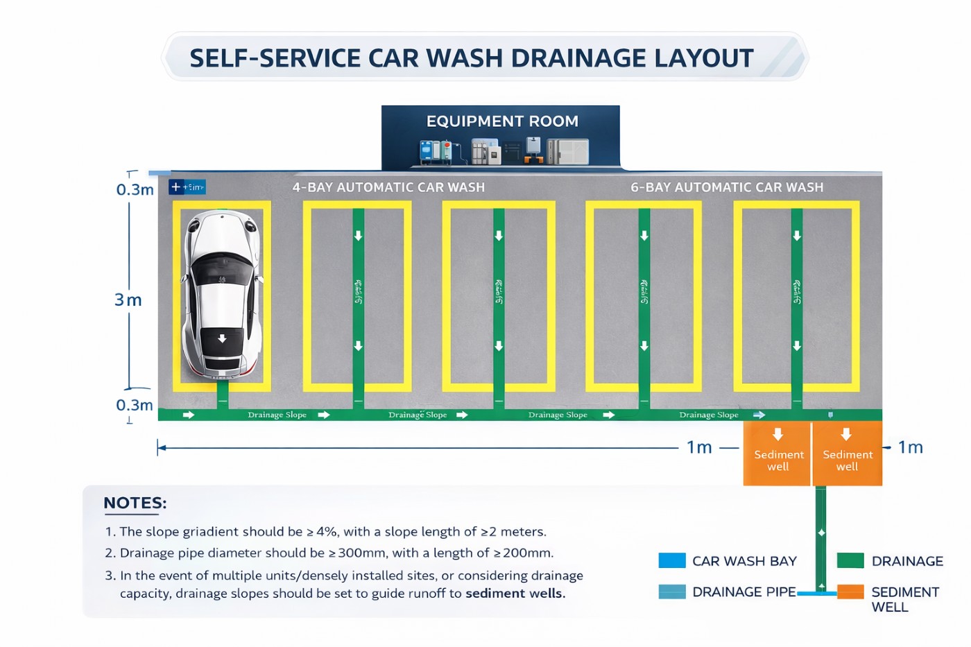 تصميم احترافي لنظام الصرف الصحي لمحطات غسيل السيارات ذاتية الخدمة، مما يضمن تدفق المياه بكفاءة، وفصل الرواسب بشكل صحيح، وتشغيل مستقر على المدى الطويل.